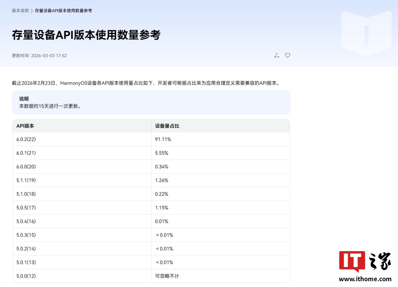 华为鸿蒙存量设备 API 版本使用数据更新,HarmonyOS 6.0.2 (22) 占比突破 90%